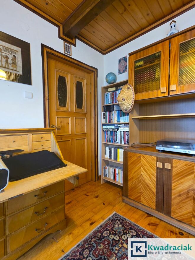 Nietuzinkowa nieruchomość, która łączy w sobie komfort mieszkania oraz możliwość prowadzenia działalności gospodarczej w tym samym budynku. Część mieszkalna (I i II piętro): Przestronne, klimatyczne wnętrza wykończone w stylu klasycznym - dominują naturalne materiały, drewno, boazeria i eleganckie parkiety. Duży taras o powierzchni 40 m² zlokalizowany nad garażem - idealne miejsce na rodzinne spotkania, wypoczynek czy letnie przyjęcia. Część użytkowa (parter): Niezależne wejście prowadzące do gabinetu lekarskiego - w pełni wyposażonego i funkcjonalnego. Całość stanowi oddzielną przestrzeń od części mieszkalnej, co zapewnia komfort prywatny mieszkańców oraz profesjonalne warunki dla klientów/pacjentów. Idealne miejsce dla lekarza chcącego kontynuować tutaj swoją działalność, ale także doskonała baza dla prawnika, kancelarii lub gabinetu kosmetycznego w branży beauty.